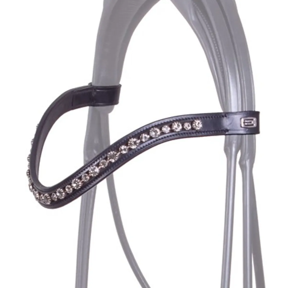 Stilfullt drop pannebånd i sort italiensk lær med Swarovskistener i grått.