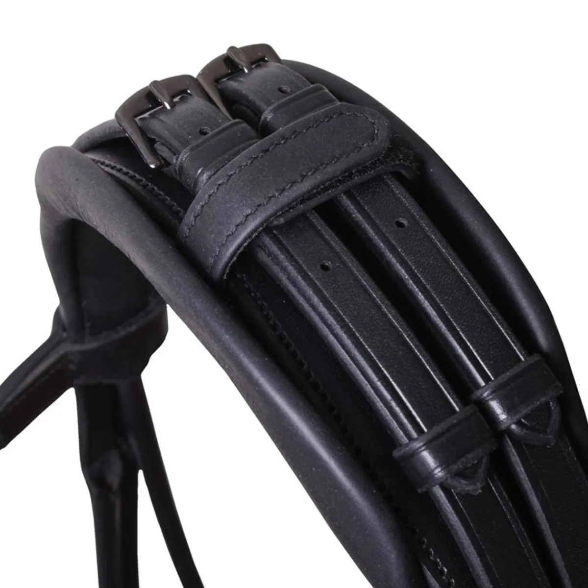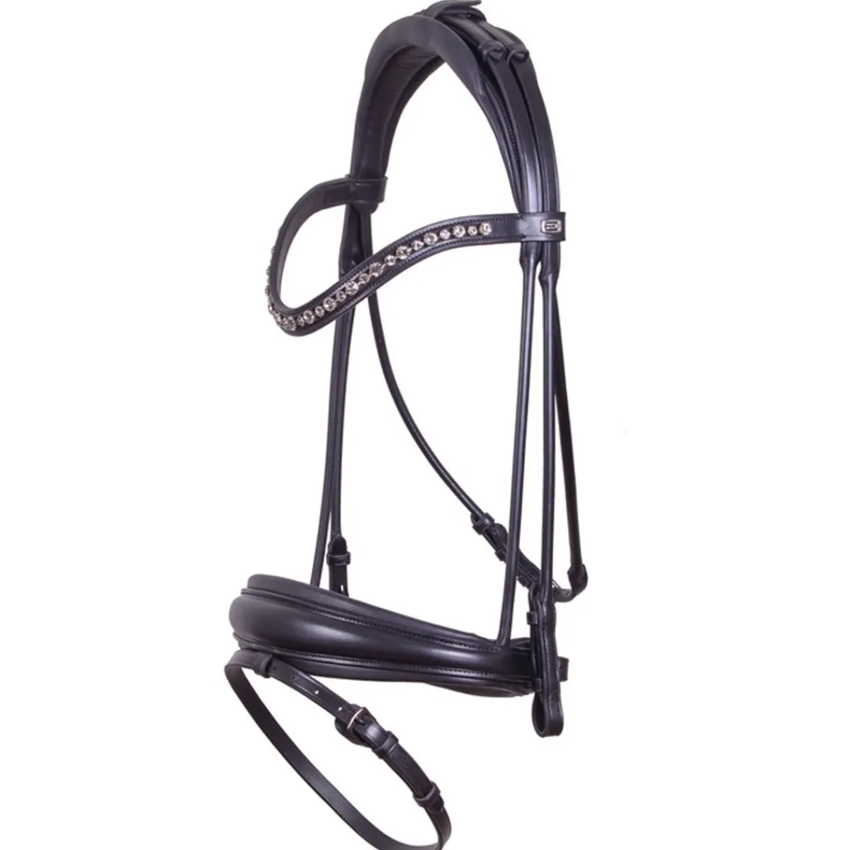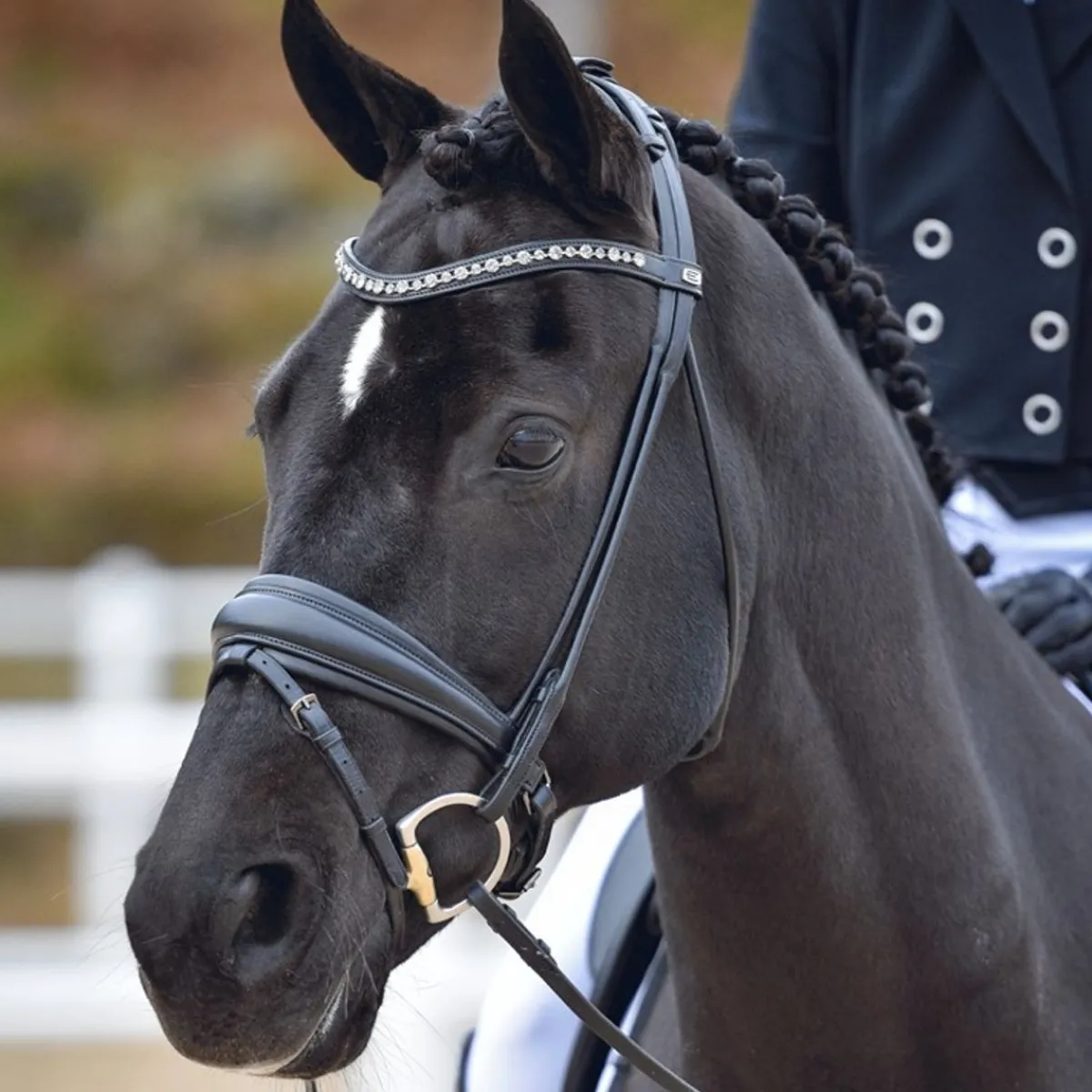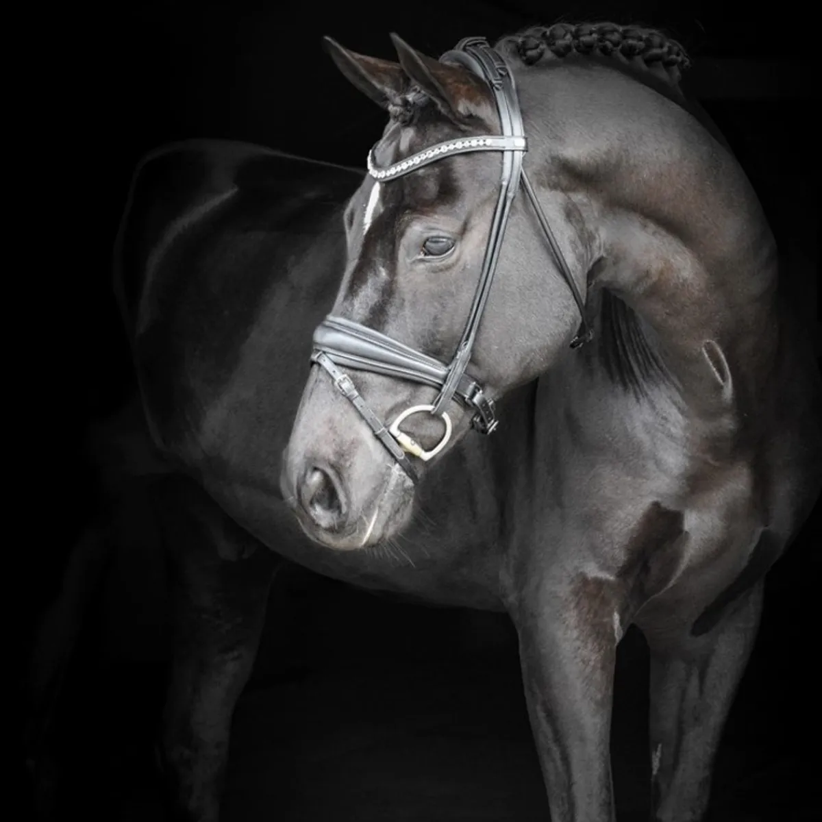 Elegant rundsydd dressurhodelag i eksklusivt italiensk skinn. Sidepanelene har spenner i nakken for et diskret uttrykk.