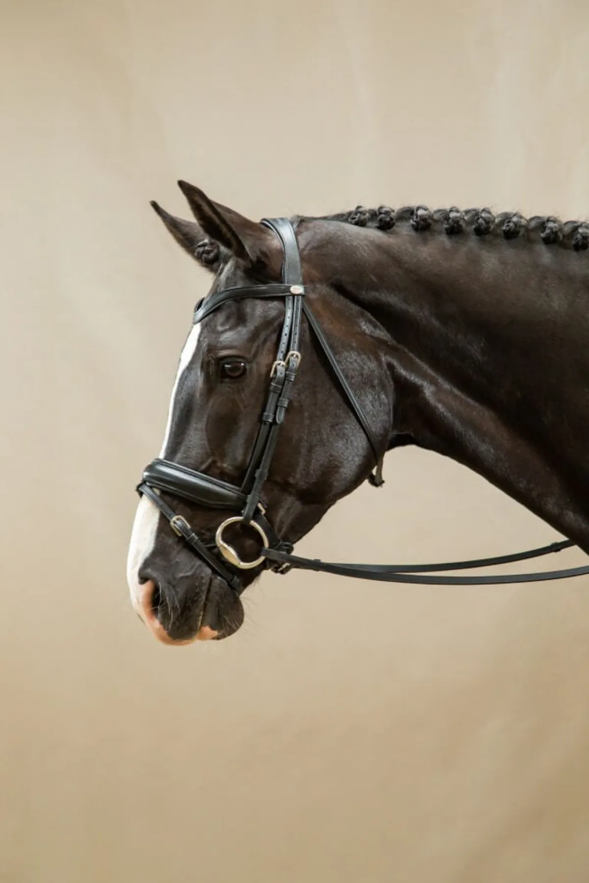 Vakkert buet pannebånd med Dyón logo. Pullback nesereim i smidig lær med myk padding under spennen for å beskytte hesten mot sår og for ekstra komfort.