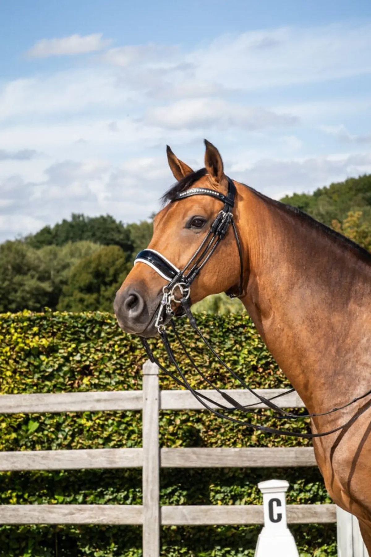 Neopren padding, foret med extra mykt lammeskinn. Kombinert nesereim i lakkert lær ca 3,8 cm bred. Pullback lukking med nylon forsterkning og beskyttende pad i mykt lær. Innovervendte spenner ved bittet.