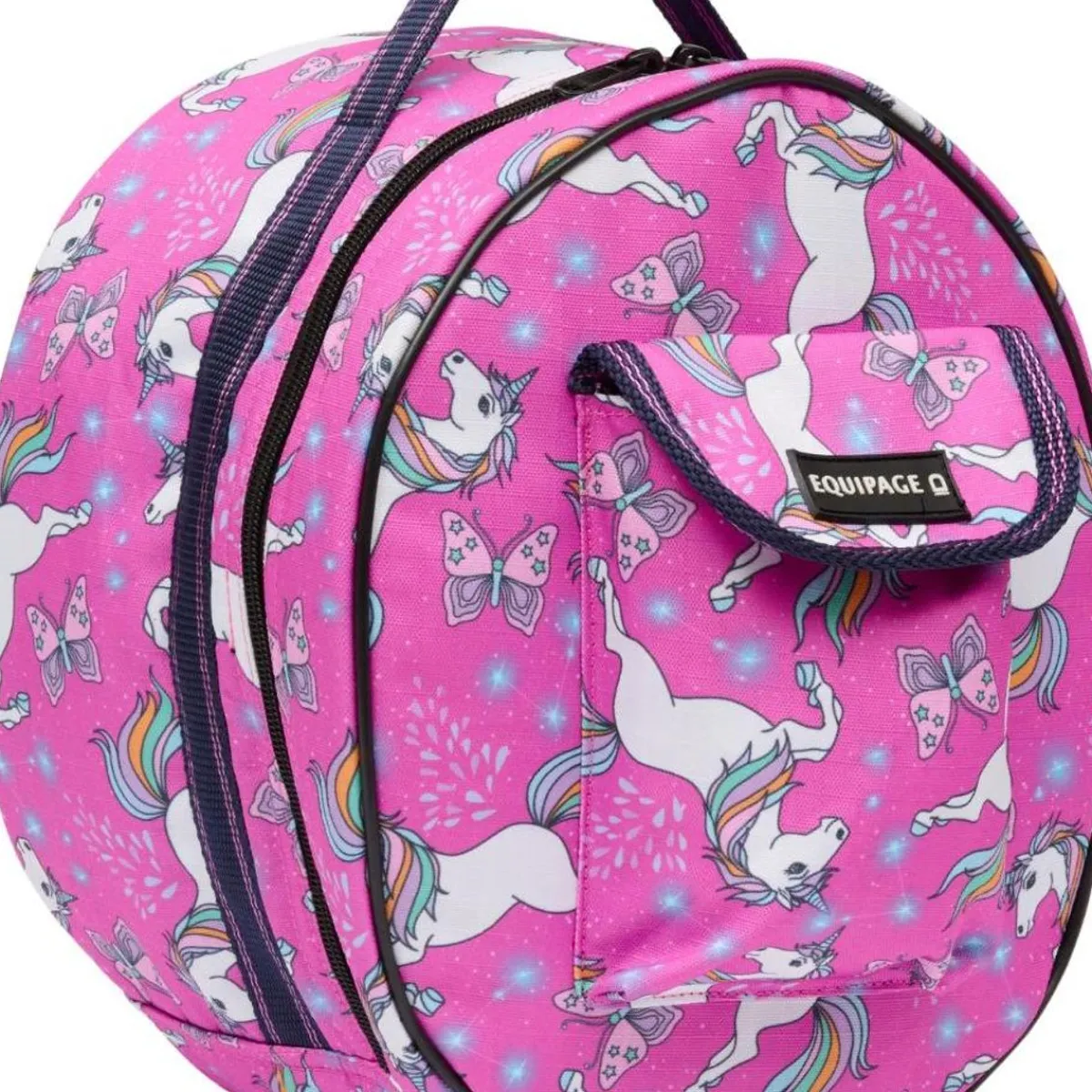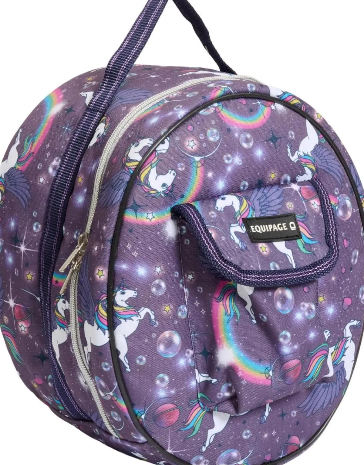 Enkelt håndtak med monokrom logomerke i stigbøylegummi. Slitesterk og vanntett materiale med flerfarget enhjørningdesign.