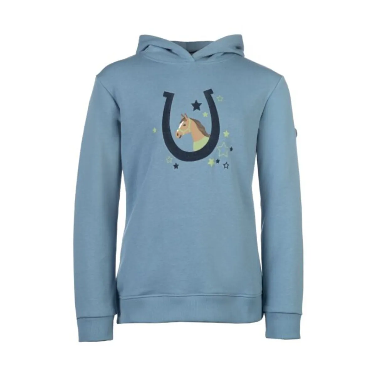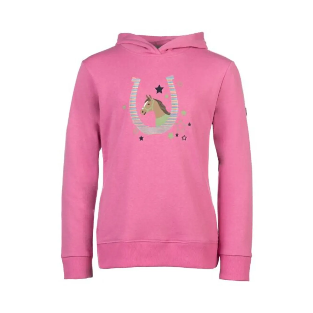 Den koselige hetten og elastiske mansjetter og fald gir ekstra komfort og perfekt passform. Det nydelige trykket med broderi foran er et spesielt høydepunkt: et søtt hestehode i en hestesko omgitt av små stjerner gjør denne hettegenseren til et ekte blikkfang!