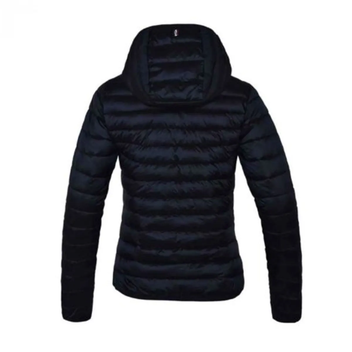 Kort, feminin, vattert jakke med avtakbar hette.