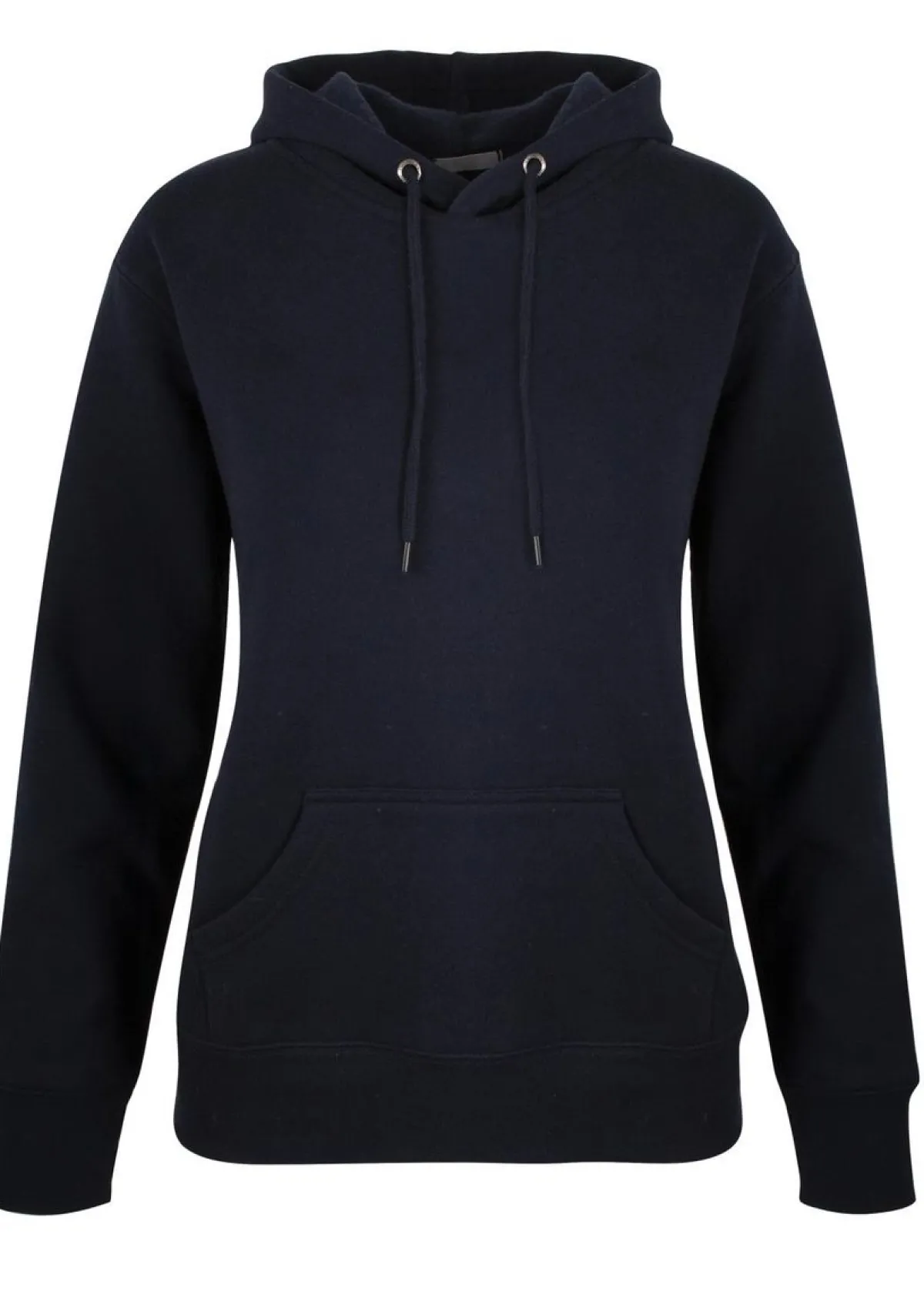 Hettegenser til dame. Lett figursydd. Dobbel jerseystrikket, flosset innside, forsterkede sømmer og lycra i alle ribber. Dobbel hette med snøring. Stikklomme med mediaport i front. 65% bomull / 35% polyester.
