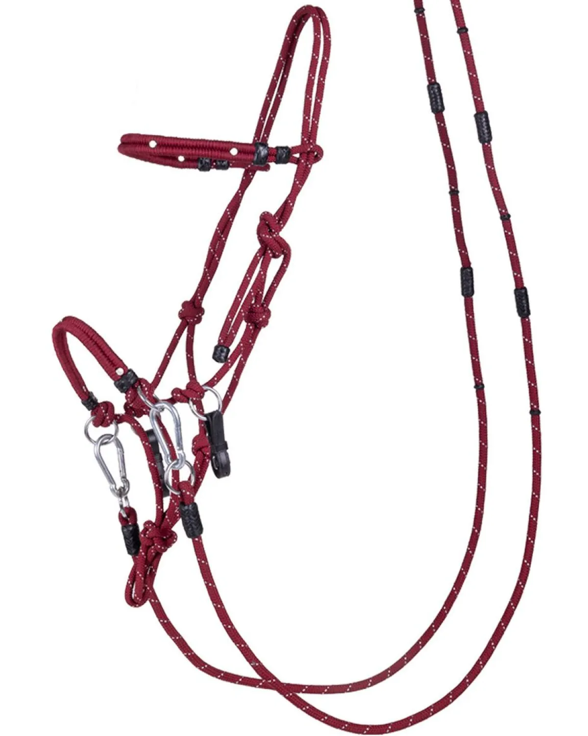 Med dette multifunksjonelle settet kan du gå i alle retninger. Du kan ri den med eller uten bitt, men på grunn av de avtakbare tøylene og pannebåndet kan du også bruke grimen til grunnarbeid og naturlig hestekunst! Den solide taugrimen er laget av en tykk snor med glittertråd vevd gjennom.