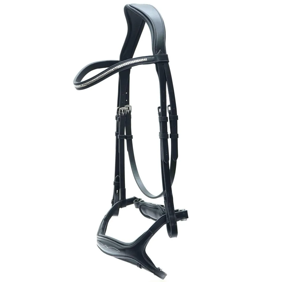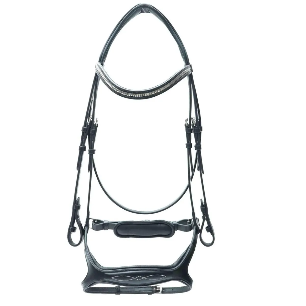 Sort hodelag i lær med flotte, hvite sømdetaljer og anatomisk nesereim!