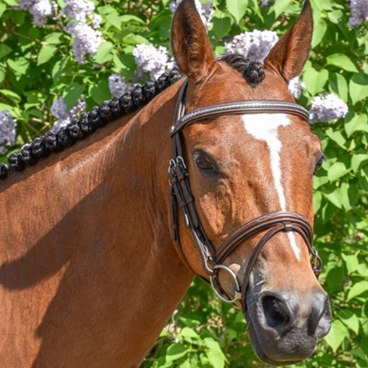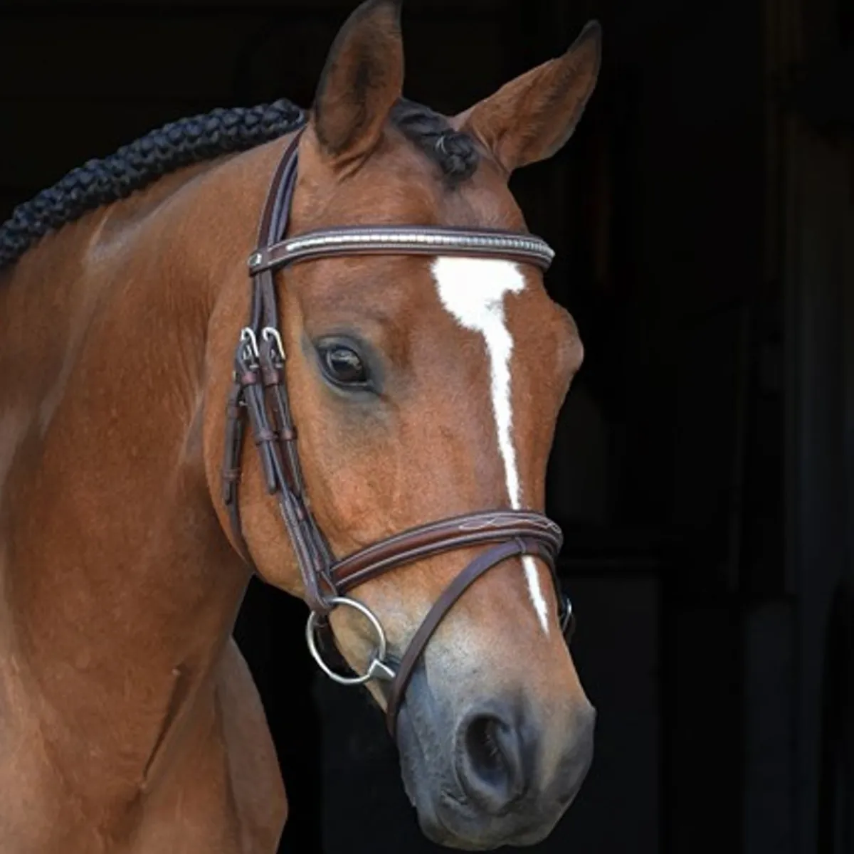 Elegant hodelag i italiensk lær med stilige hvite sømmer, sølvspenner, klassisk pannebånd med stilige sølvklinker og kombinert polstret nesebånd med nydelig mønstersøm!