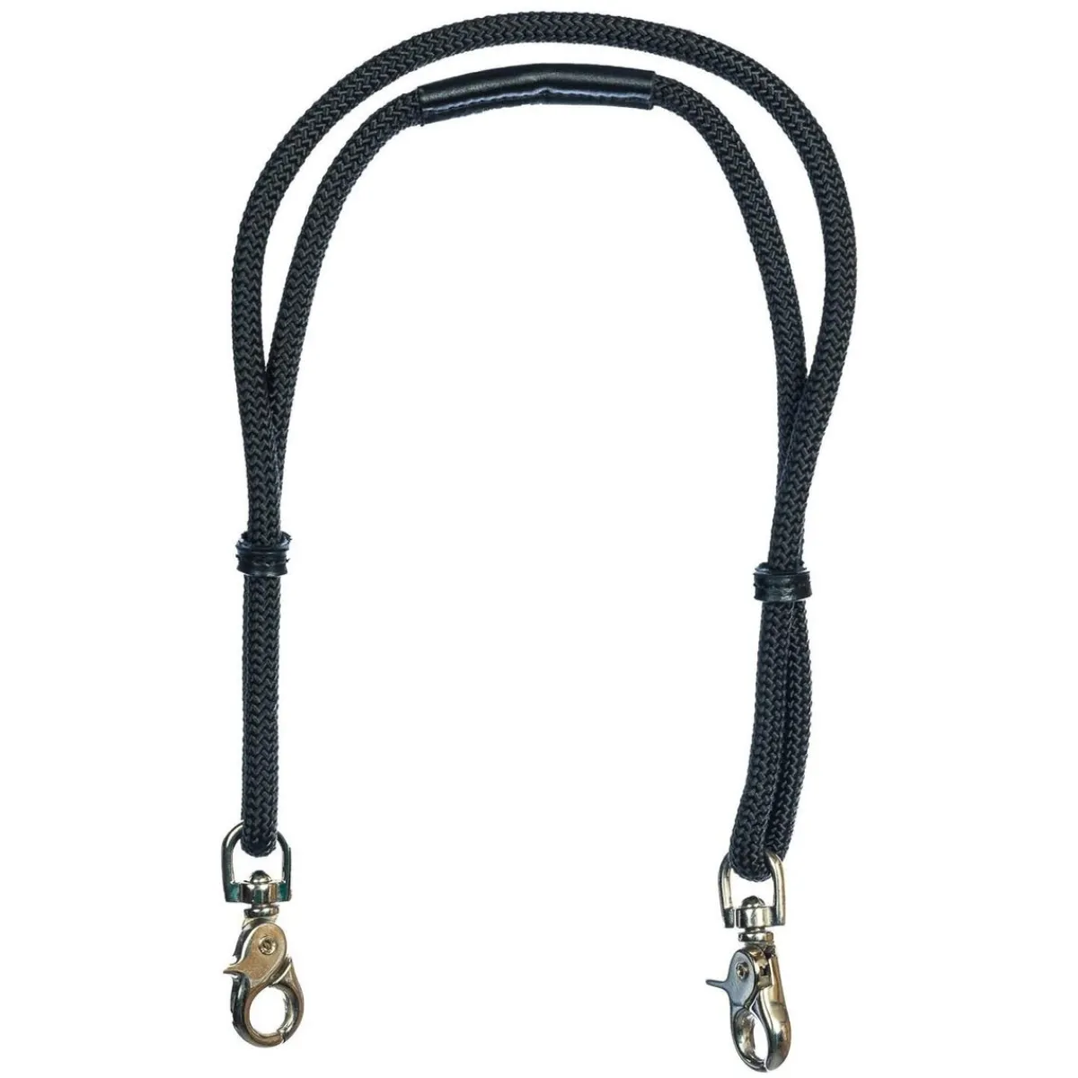 Den myke stroppen av nylon og skinn henges over salen og stigbøylene er montert på karabinkrokene.