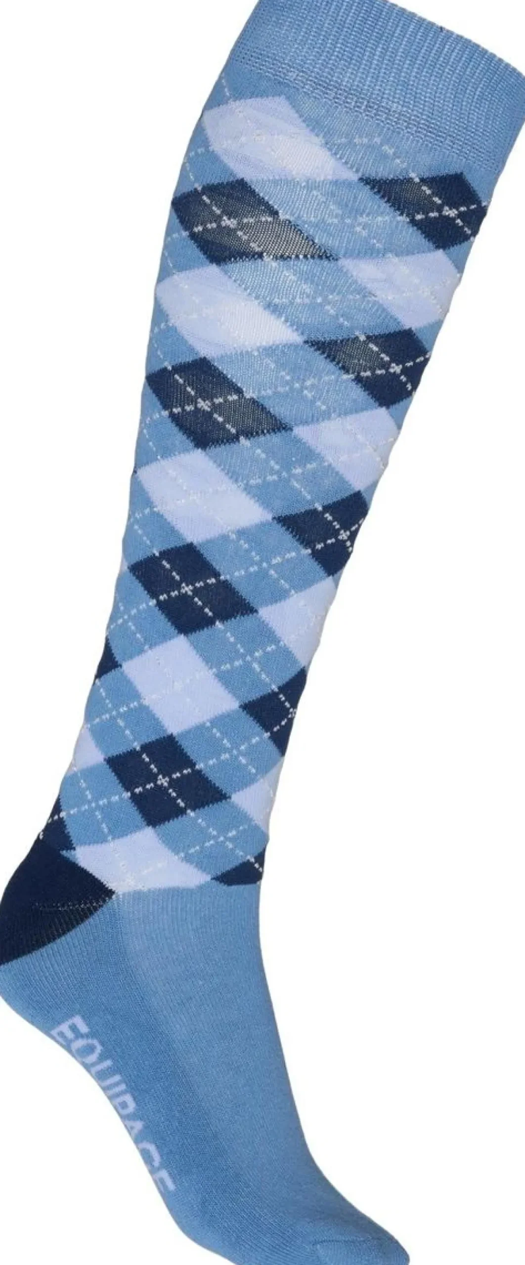 Tradisjonell lang ridesokk. Det klassiske skotske Argyle-mønsteret har en glitrende lurex-strikk som løper gjennom hele mønsteret.