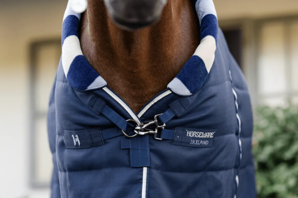 Horseware NewMarket Cosy Stable-dekkenet er laget av en sterk, slitesterk 1000D Ripstop-polyester pustende ytterside med en luksuriøs, koselig, polstret fleecekrage for å forhindre trekk i kaldere vær! Thermobonded fiberfyll gir overlegen varme for langvarig varme for å holde hesten varm, og mikrofiberfôret som sitter ved siden av hestens hud er pustende og fuktabsorberende.