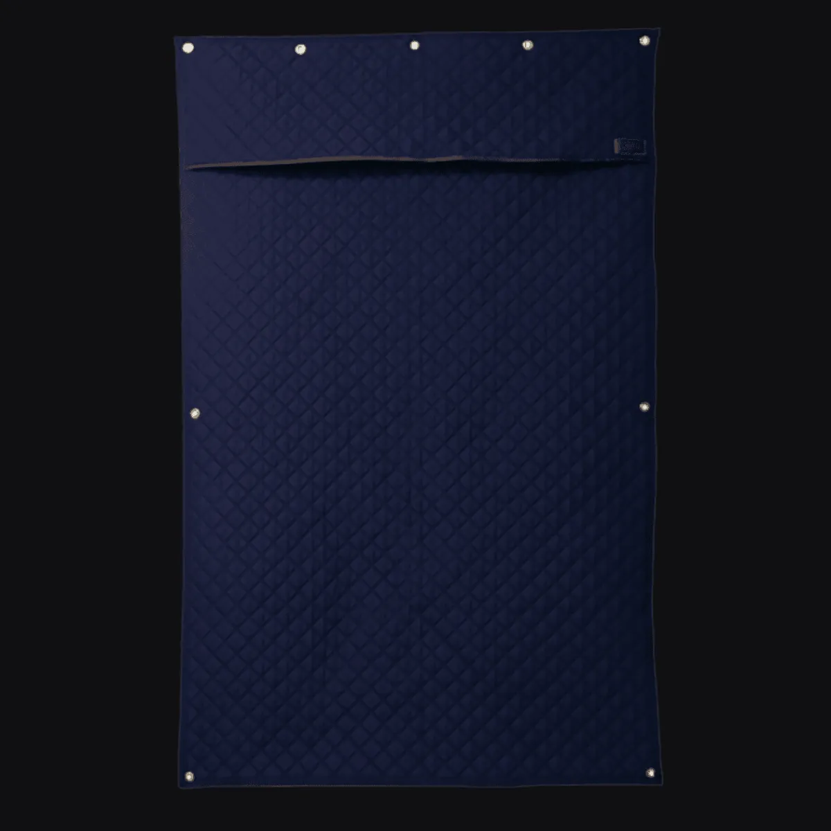 Stilig stevnegardin i marine med brune lærdetaljer. Stallgardinet har 5 enkle kroker under slik at man kan henge opp dekkenstige, hodelag eller det man måtte ønske.