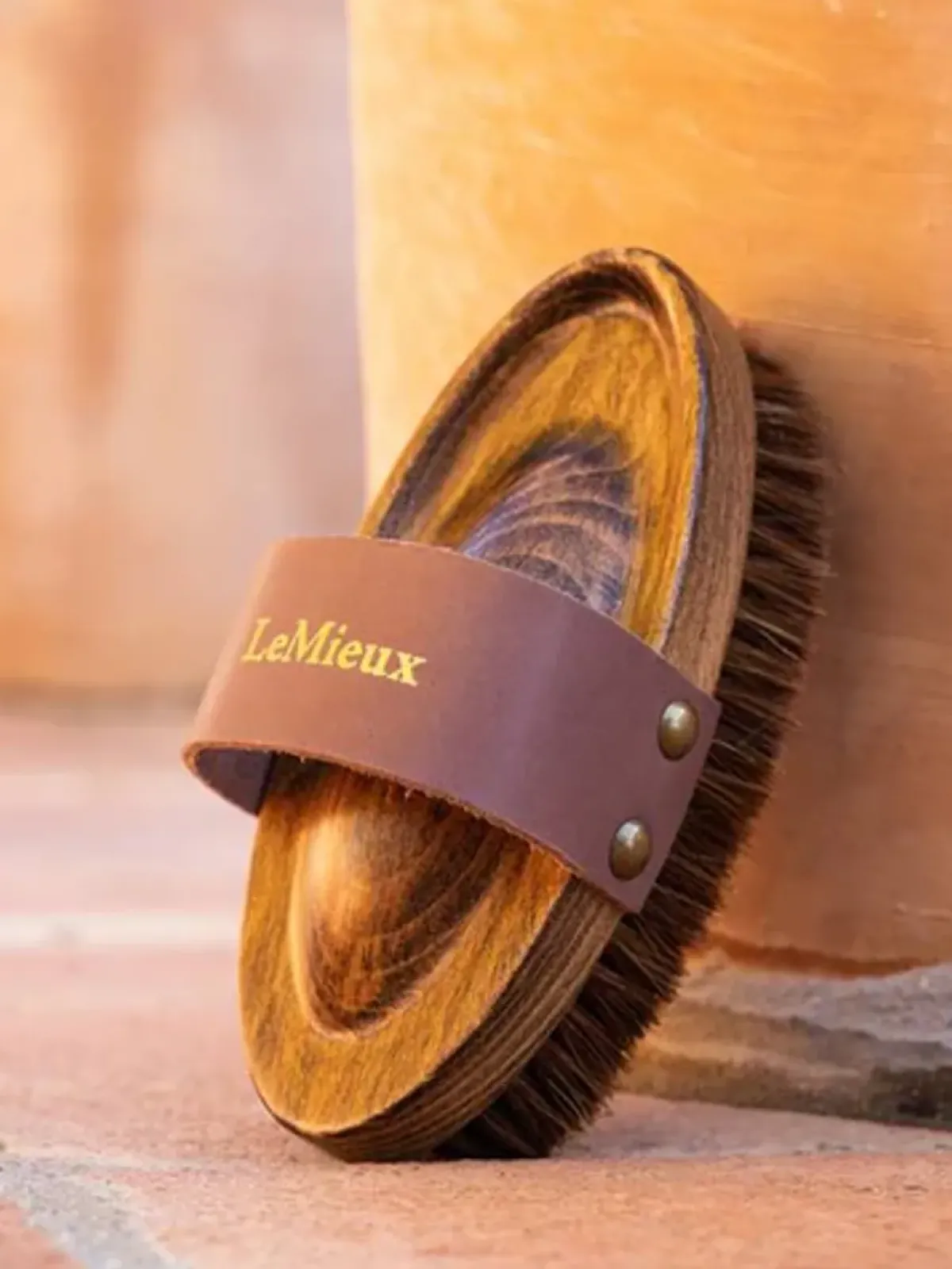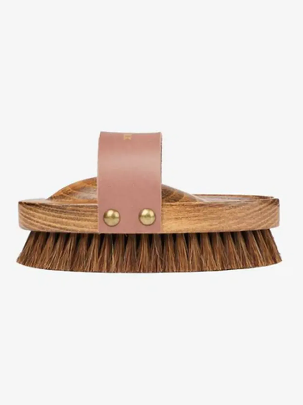 Lærremmen med gullfolie-prægede logo gir et sofistikert preg, mens den solide trebasen gir en ergonomisk passform i hånden for økt komfort mens du børster.