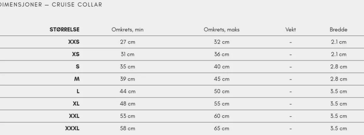 Denne typen halsbånd er enkle å ta av og på hunden, og skånsomme mot pelsen. For din hunds sikkerhet har Cruise collar to striper med 3M™ refleks rundt hele den polstrede delen. Dermed er halsbåndet synlig fra flere vinkler. Vi har også laget et eget festepunkt til lys*, forsterket med hypalon. Cruise collar er laget av lette og solide materialer som er komfortable for hunden din. Innsiden er foret med myk og slitesterk neopren. Alle sømmer og kanter på innsiden av halsbåndet er sydd med den glatte siden mot hunden for å skape en jevn og myk overflate som ikke gnager.