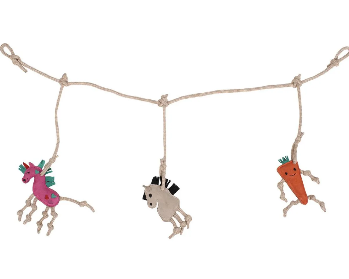 Går hesten din noen ganger lei i stallen? Da kan bokshengeren med hesteleker være nyttig! Den er lett å henge opp i bomullstauet. Da vil hesten din ha flere kompiser i stallen og vil kjede seg mindre!