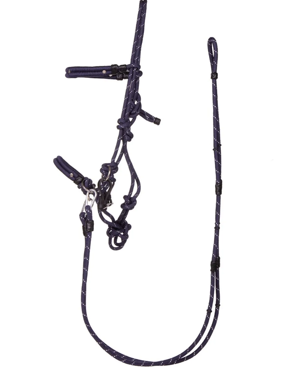 Med dette multifunksjonelle settet kan du gå i alle retninger. Du kan ri den med eller uten bitt, men på grunn av de avtakbare tøylene og pannebåndet kan du også bruke grimen til grunnarbeid og naturlig hestekunst! Den solide taugrimen er laget av en tykk snor med glittertråd vevd gjennom.