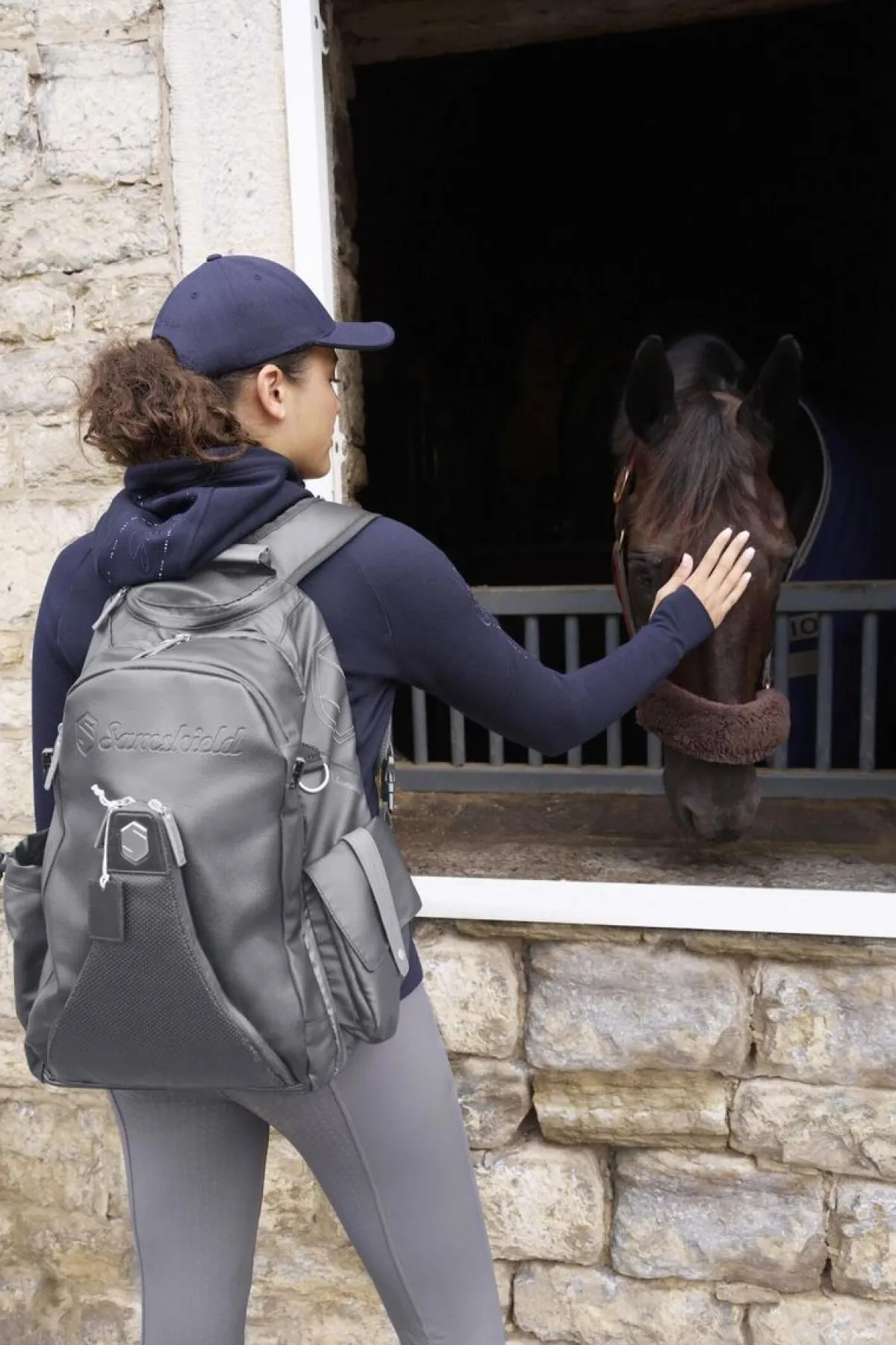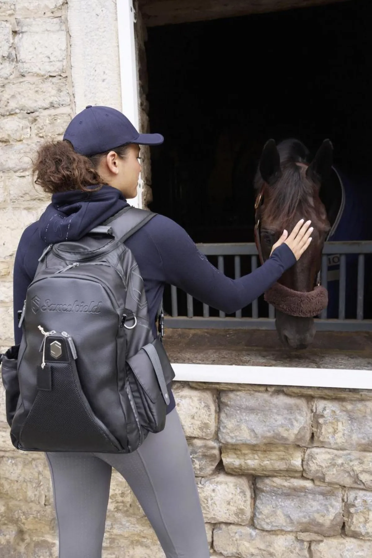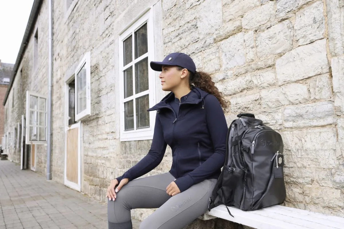 Hjelmen kan settes fast i ryggsekken og oppbevares i en lomme som ikke er synlig. Selve bunnen av sekken er produsert slik at den ikke skal slites og har maksimal holdbarhet. Sekken har to store rom: en koffertseksjon og en annen åpning til et rom der du kan oppbevare ustyr til show og et par sko. Baksiden av ryggen er kompresjonstøpt og dekker komfort og god passform som gjør det mulig å bruke sekken over en lang periode. Stroppene er justerbare, komfertable, fleksible og stroppene på brystet gjør det enklere å ri.