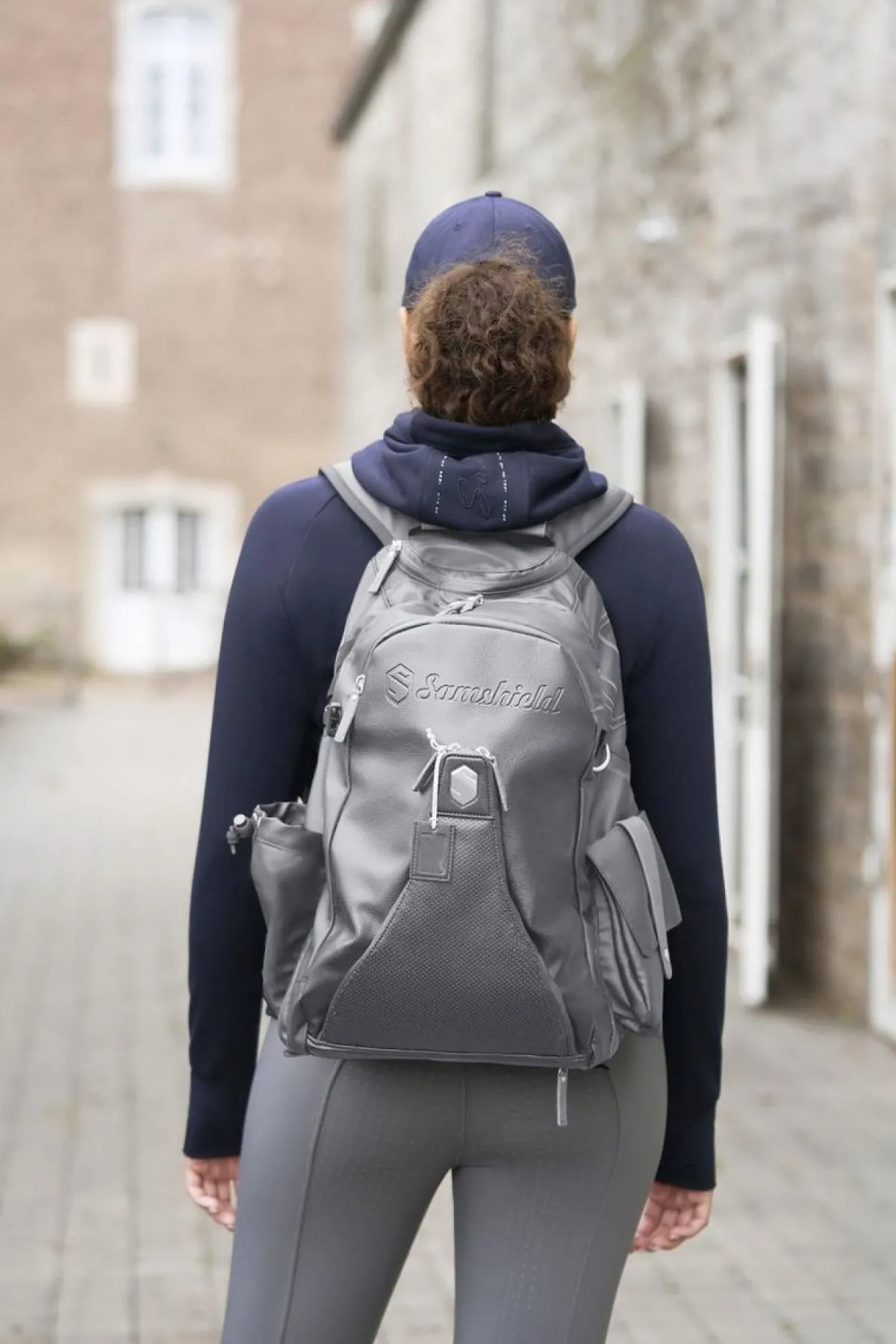 Sekken er praktisk og produsert/designet spessielt for ryttere. Samshield iconpack er laget av 1200D polyester. Det er et materiale som er veldig sterkt, motstandsdyktig og vanntett. Sekken er laget slik at den tåler all slags vær. Den har blant annet vanntette glidelåser og et trekk som dekker hele hjelmen og sekken.