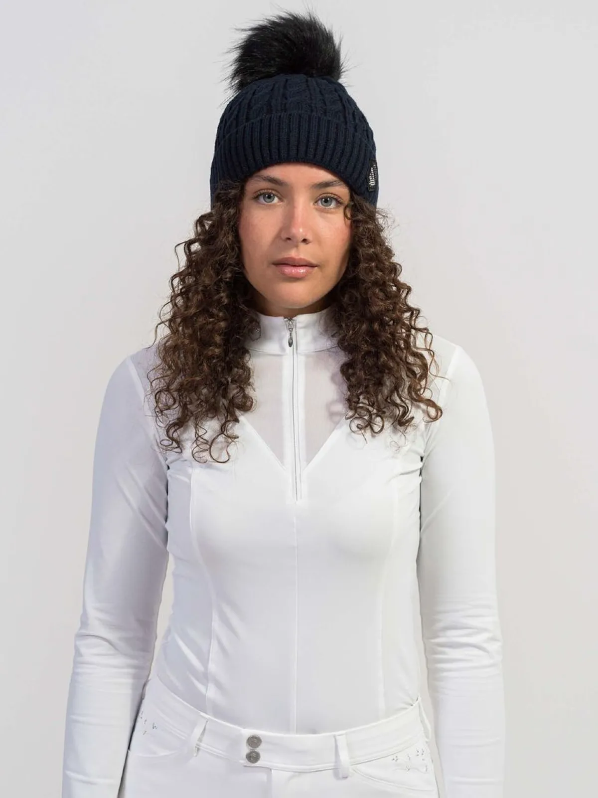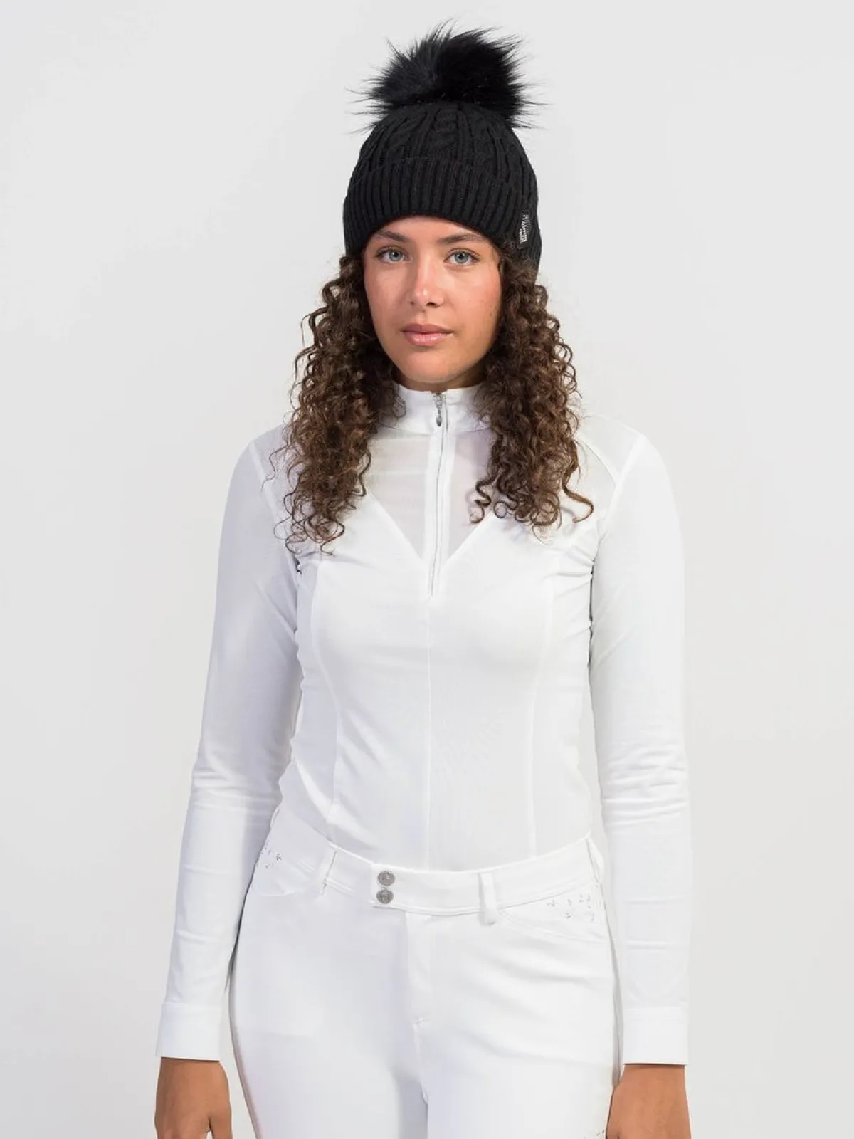Nydelig strikket lue med dusk og Samshield logoen i swarovski foran!