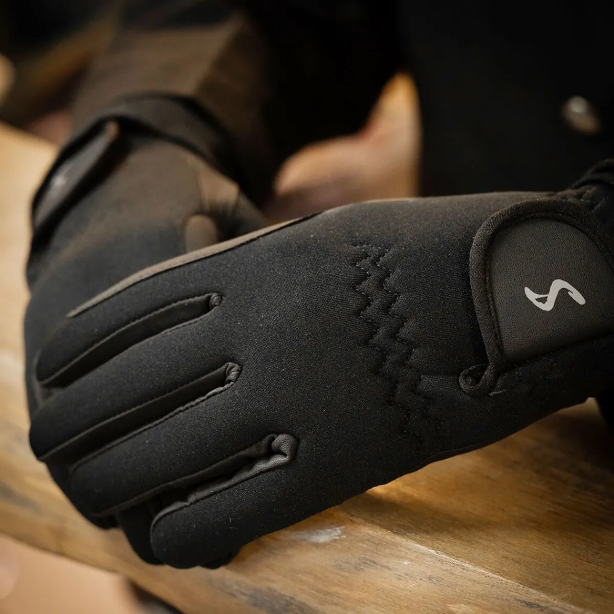 De gir et godt grep i tøylene, og du bevarer følsomheten du gjerne vil ha i hendene når du rir. Hanskene har også dette materialet mellom fingrene, og de er forsterket i tøylegrepet. Oversiden av hansken er laget i neopren, som både varmer og beskytter mot vind og litt regn. Justerbar lukking rundt håndleddet